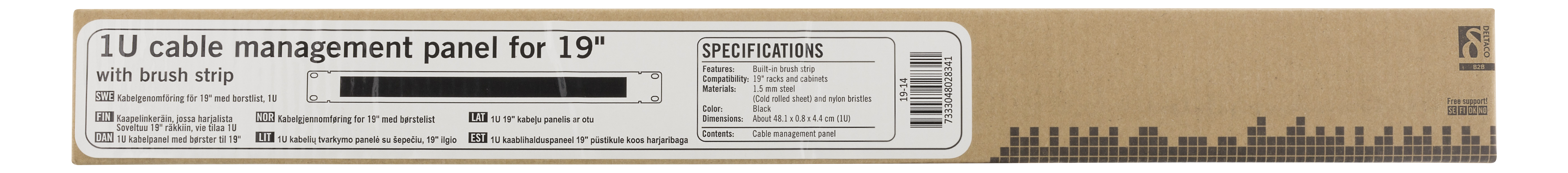 Kaapelinkeräin, joka sopii yhteen 19 tuuman räkkikaappien kanssa. Keskellä on harja, joka pitää liittimet puhtaina pölystä ja liasta.