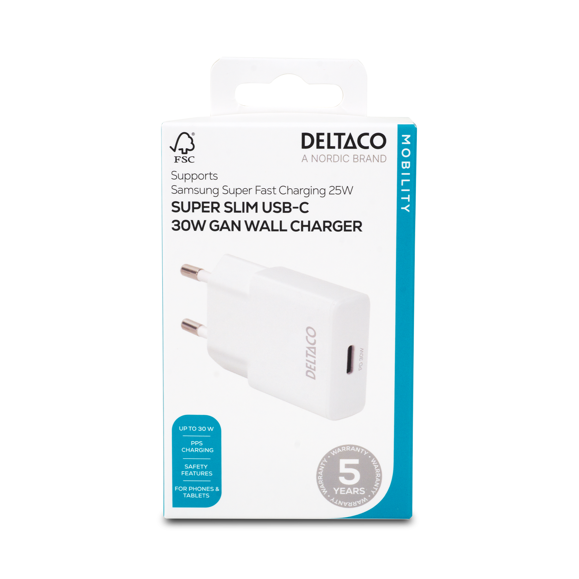 USB-C-seinälaturi, 1x USB-C PD 30 W, kapea koko, tukee PPS:ää