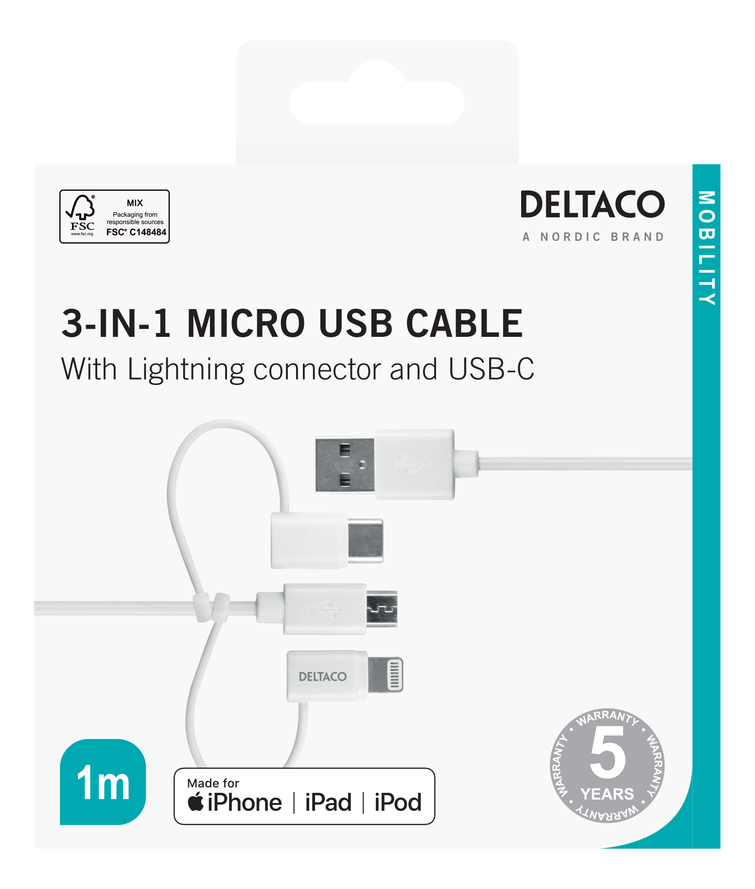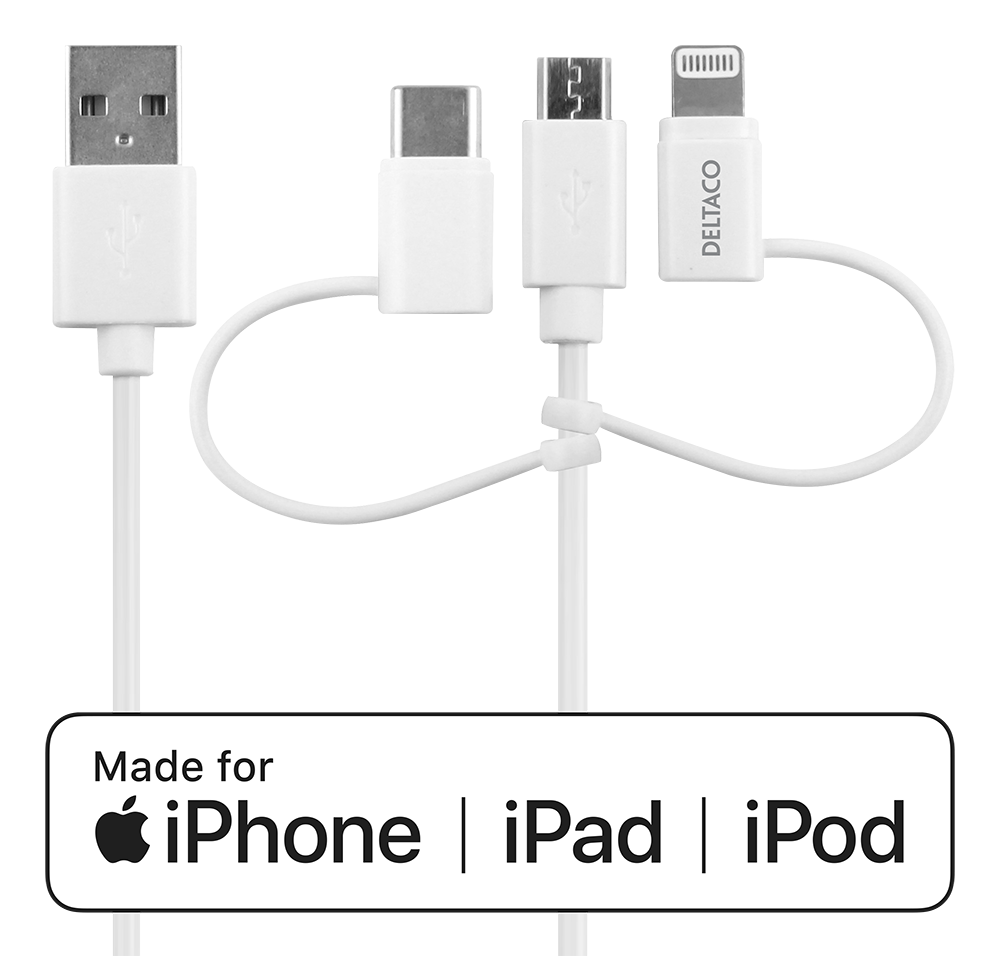 USB cable with USB-C, Micro USB and Lightning connector to be able to sync or charge most mobile devices on the market. Connect the cable to the computer's USB port for synchronization and charging or to a USB power adapter for charging via a wall outlet. 1xLightning Apple C189 chipset