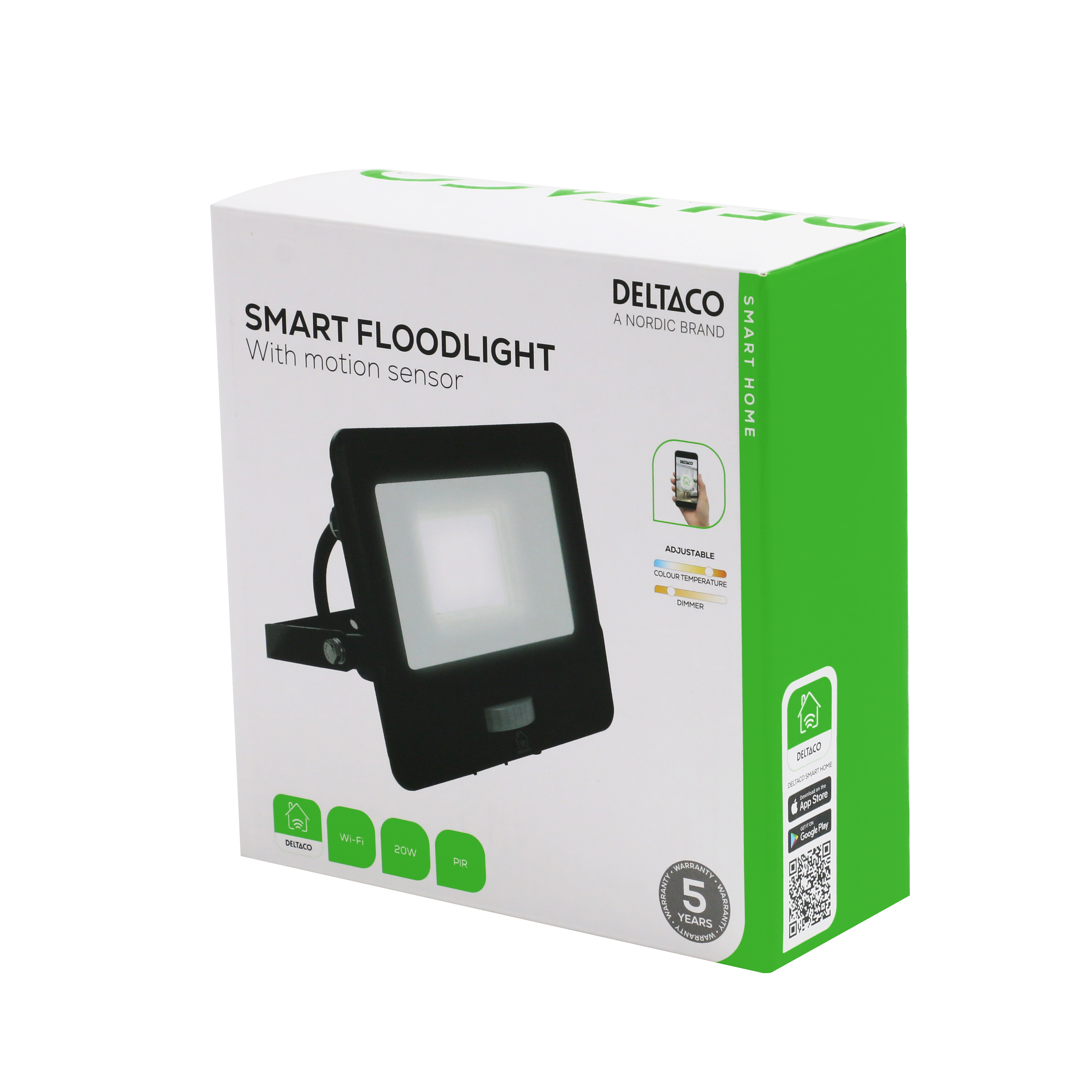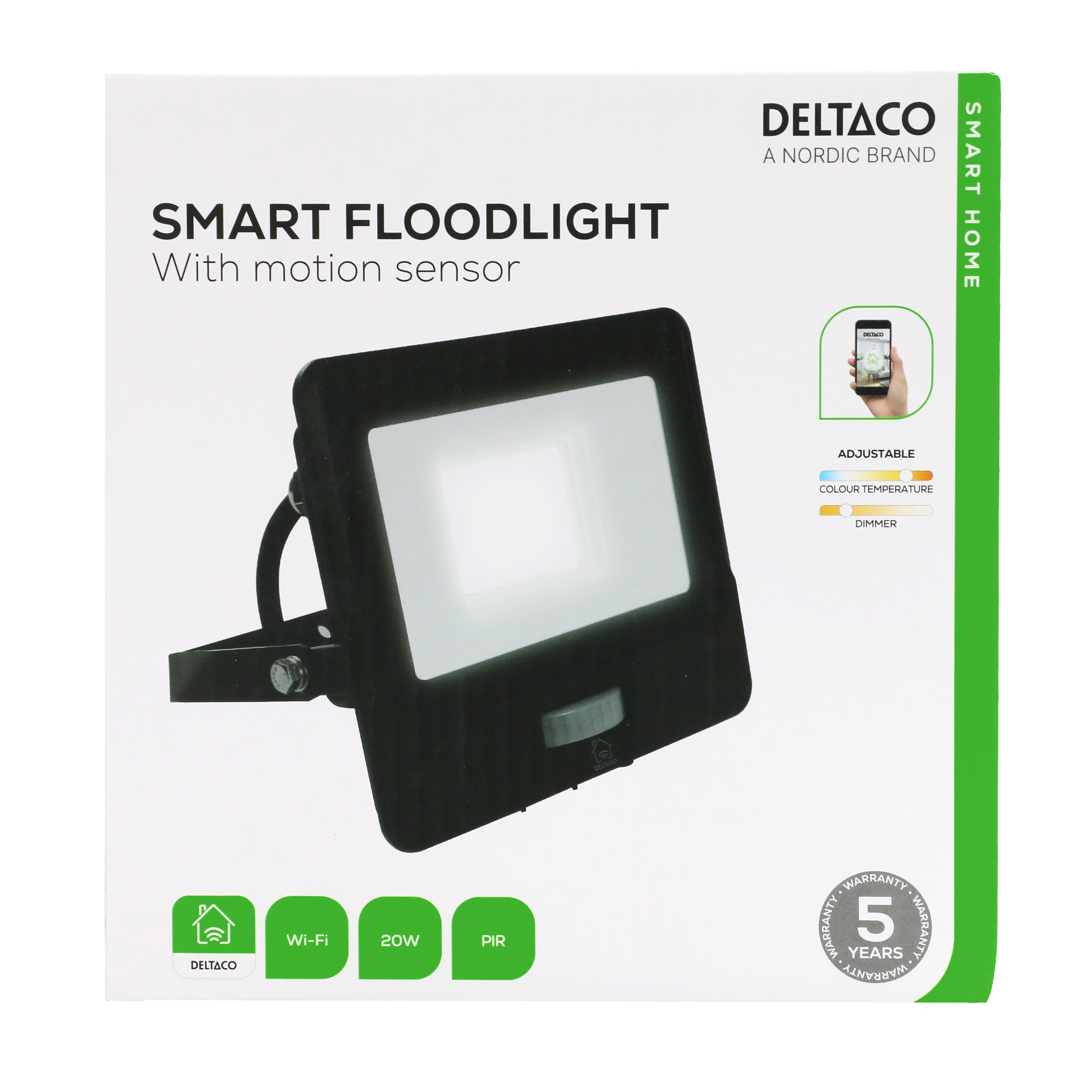 Tuotetta varten on olemassa DELTACO Smart Home -mobiilisovellus, jonka avulla sitä voi ohjata. Asennus tapahtuu nopeasti ja näppärästi, sillä se tarvitsee toimiakseen ainoastaan tavallisen langattoman verkon. Sovelluksessa voi ohjata tuotteen päälläoloa tai ajastaa, milloin se kytkeytyy päälle ja pois päältä. Valonheittimen voi asettaa syttymään esim. silloin, kun aurinko laskee. Sovellus on ilmainen, ja se toimii sekä Android- että iOS-laitteilla.