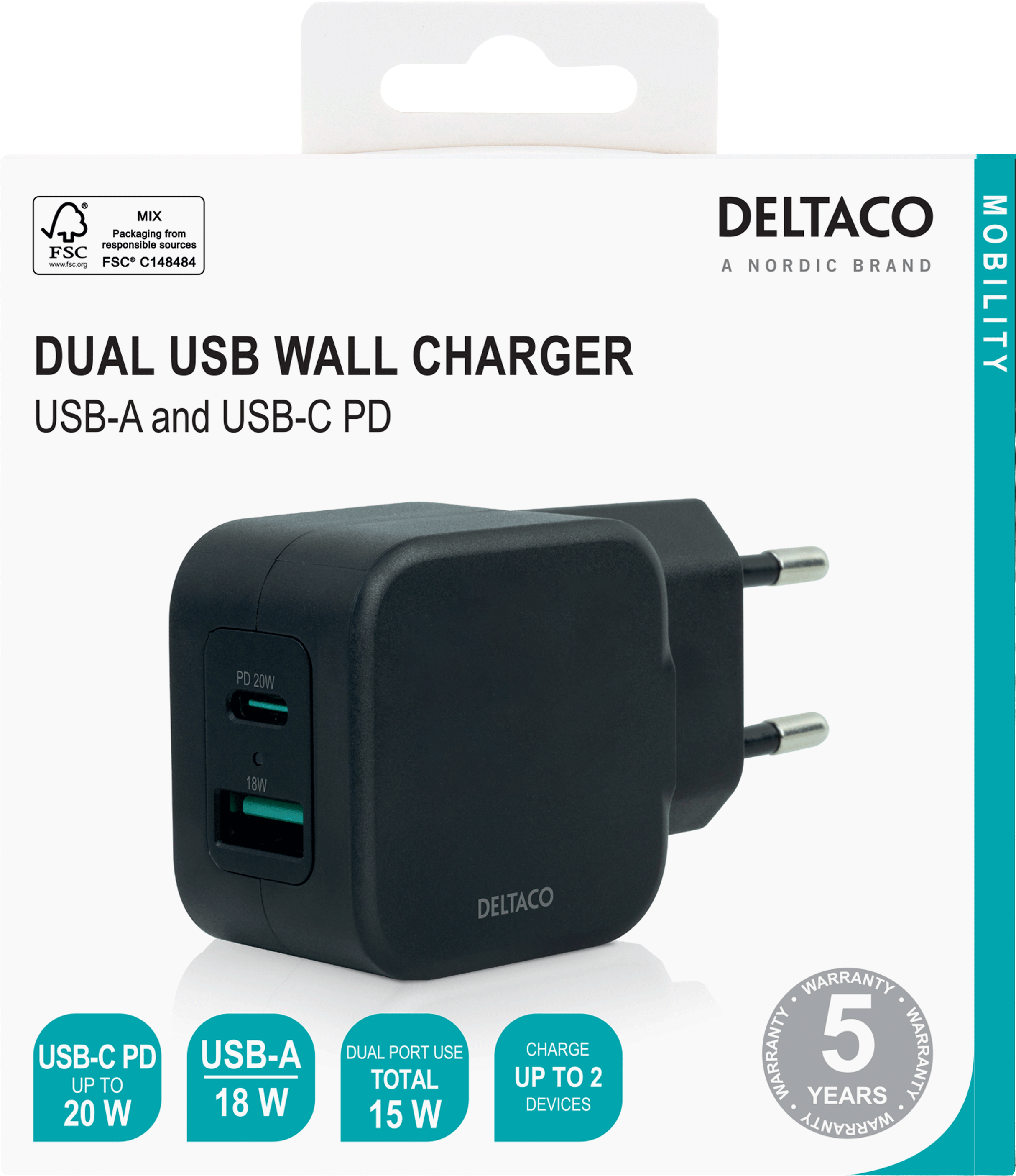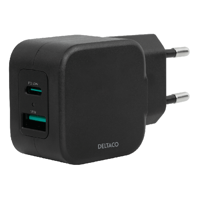 Dual USB wall charger, USB-A & USB-C Power Delivery 20 W, black